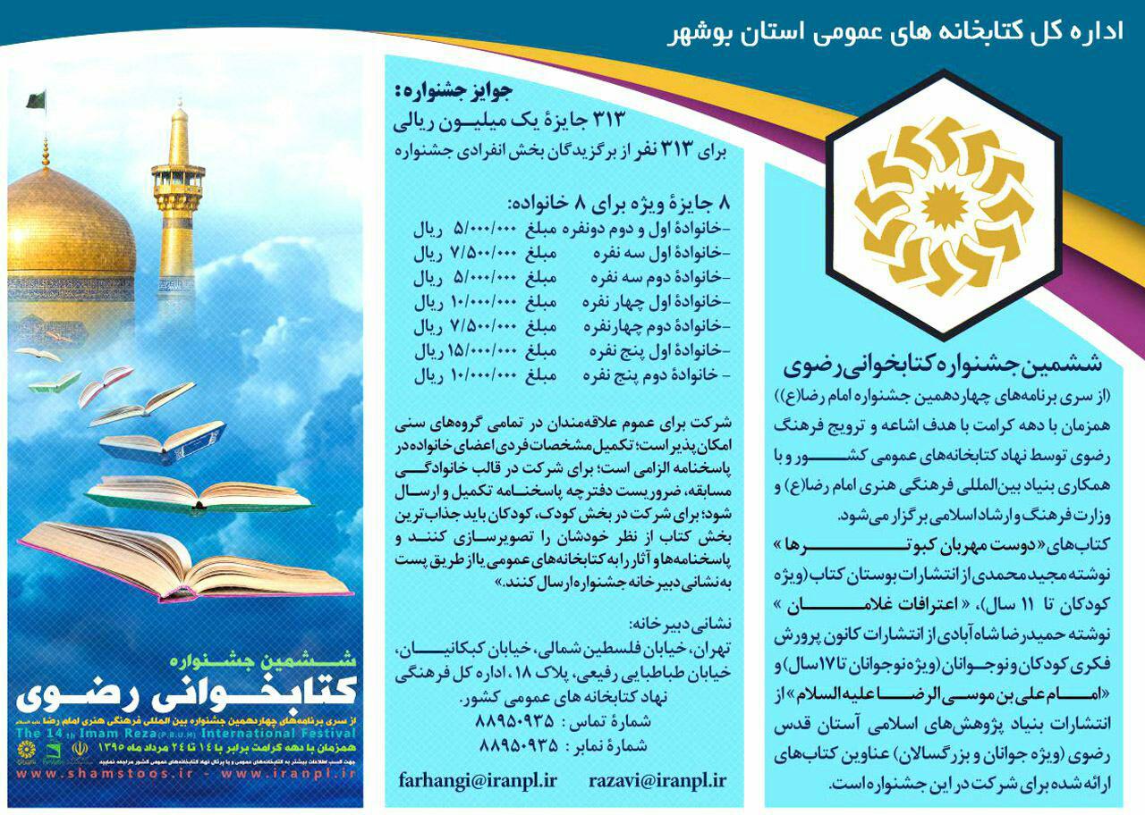 مسابقه کتابخوانی جشنواره رضوی با جوایز ویژه و بی نظیر بصورت انفرادی و خانوادگی.جهت دریافت کتاب و پاسخنامه به کتابخانه عمومی شهدای وحدتیه مراجعه فرمایید.